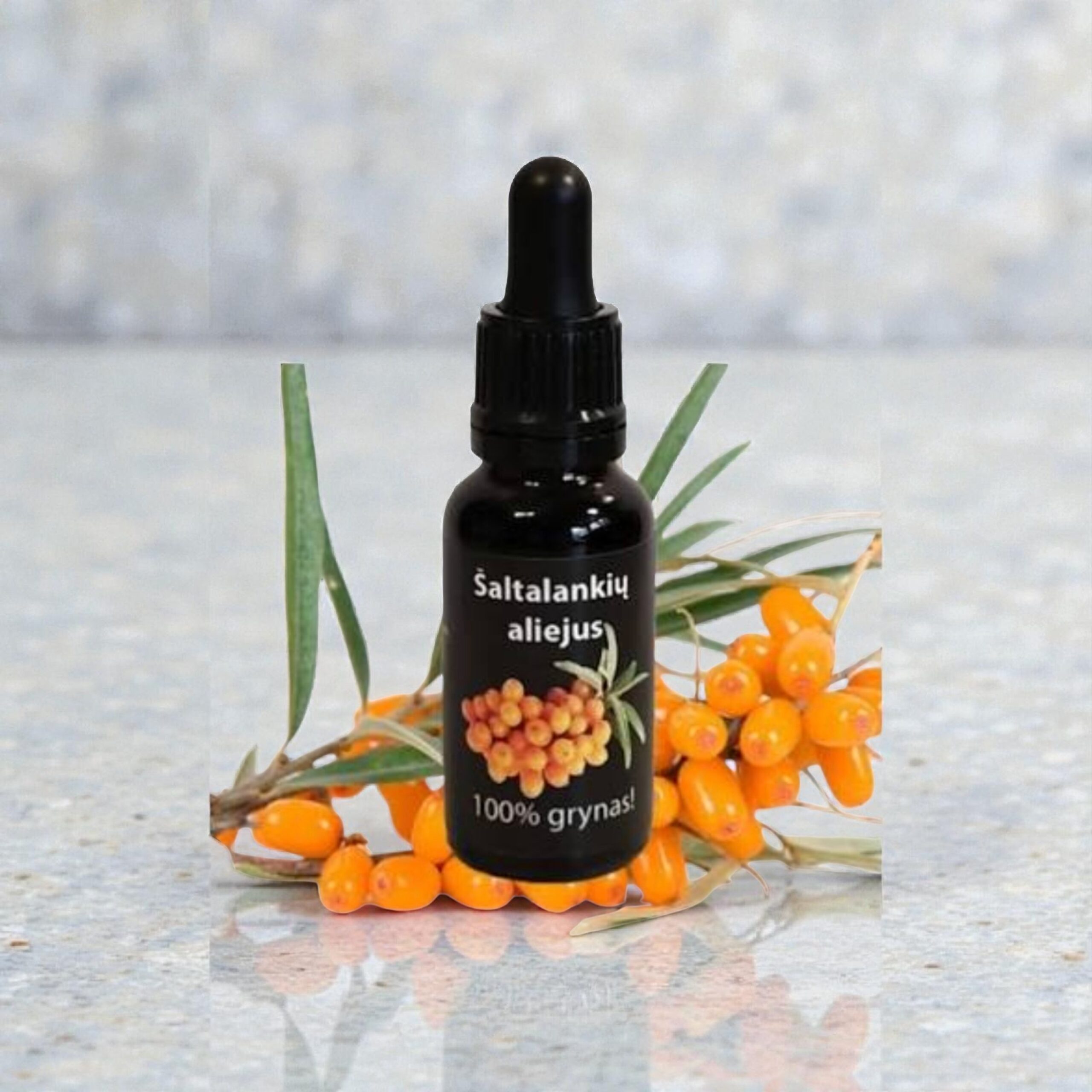 „Rinkitės 100 % gryną šaltalankių aliejų — natūralus omega riebalų ir antioksidantų šaltinis, skirtas kasdieniam palaikymui.“